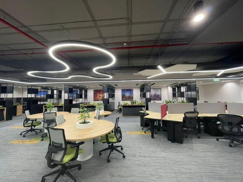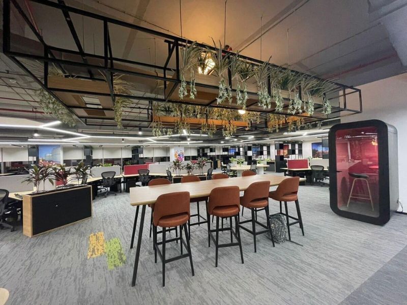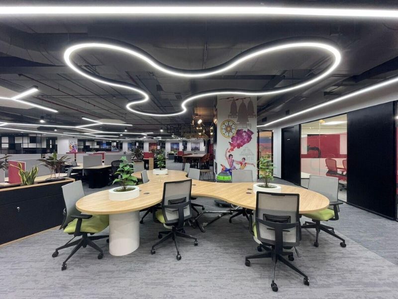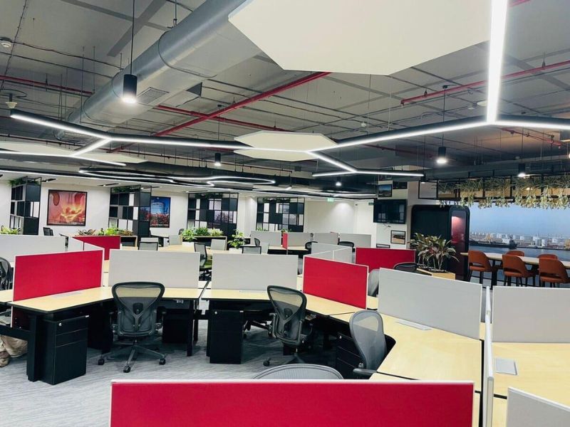 The office features high-efficiency workstations, executive cabins, multiple meeting rooms, conference rooms, a spacious reception lobby, a server/UPS room, and an internal cafeteria/pantry zone. Designed with modern interiors and efficient layout planning, the workspace supports higher employee productivity and seamless operations.