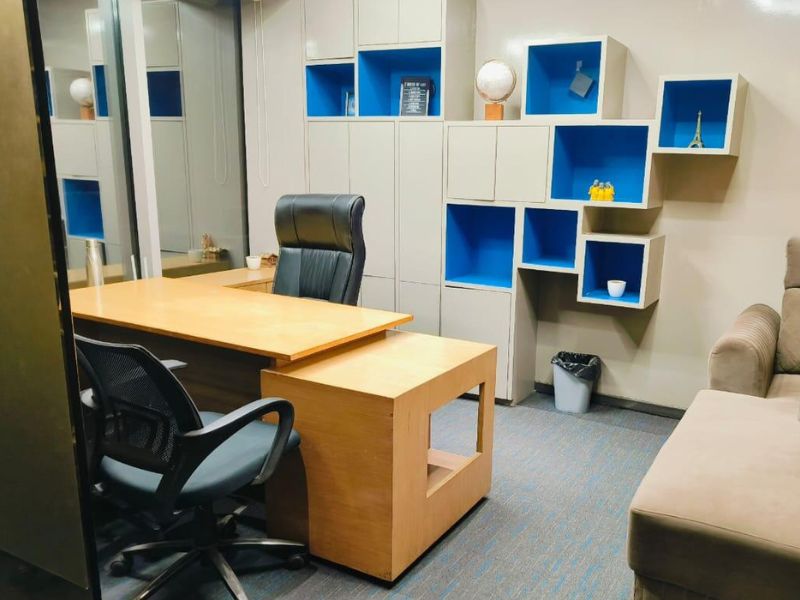 Layout: 2 private washrooms, pantry, 4 cabins, reception + waiting area, server room