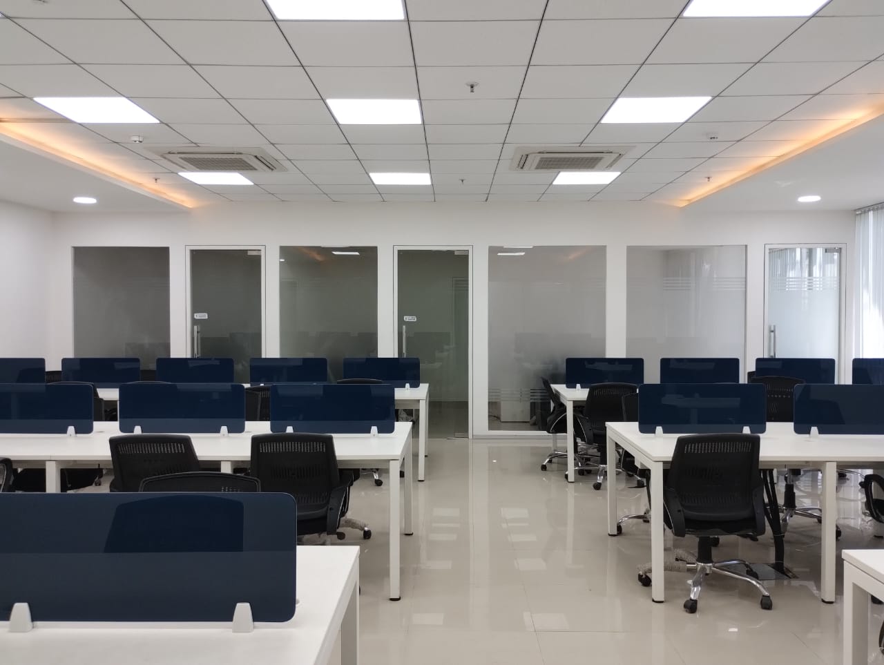 Setup: 3 Cabins | 1 Conference Room | 55 Workstations | Reception | Server Room | 15-Seater Cafeteria Space